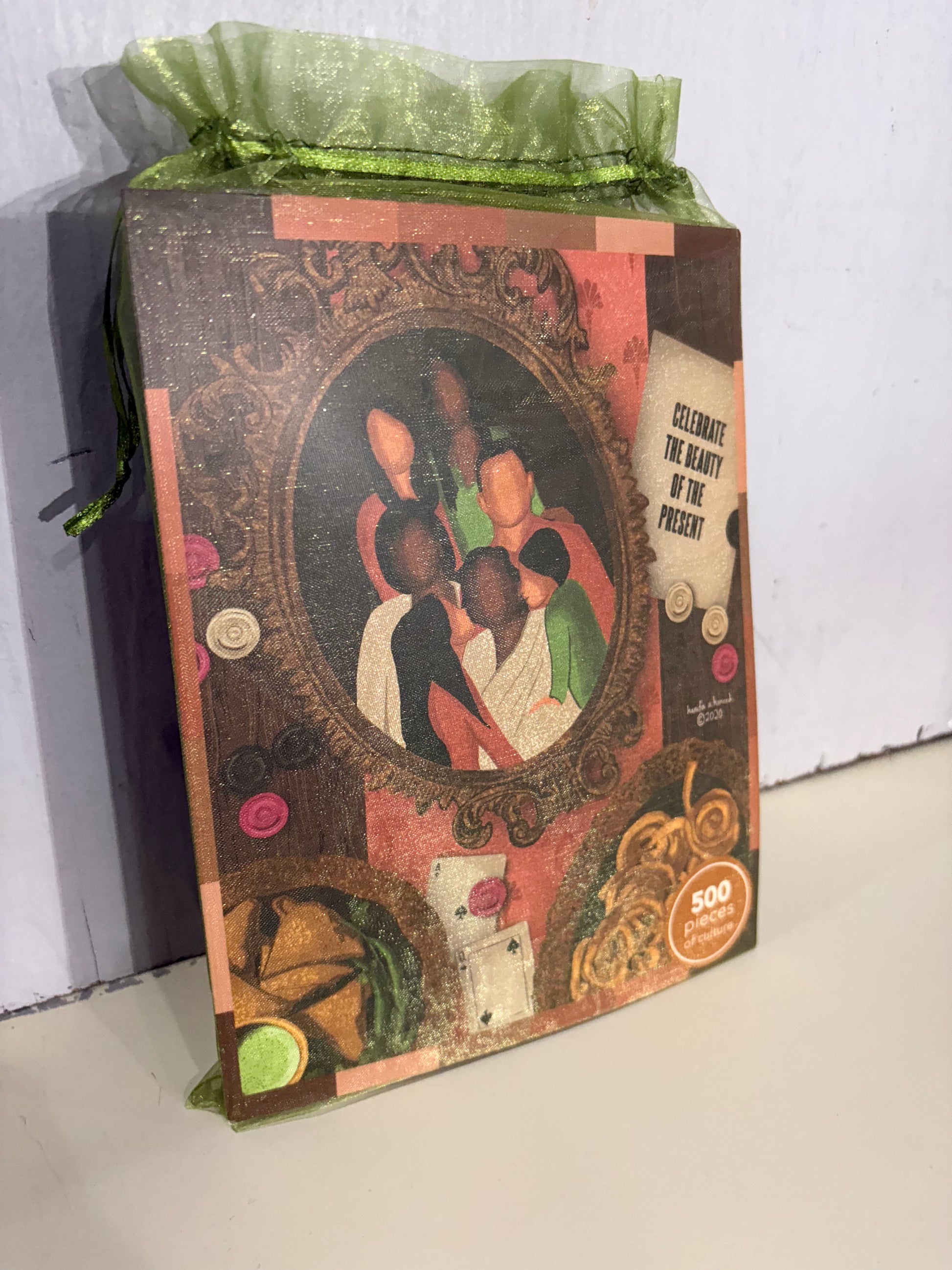 - The artist uses earth tones and messaging inclusive of a family photo with samosas and jalebi on the side, topped with carom pieces and a deck of cards. By transforming this art into puzzle form, this artist remains true to her intent to celebrate the beauty of the present as puzzling also provides yet another opportunity to spend meaningful time with family and friends. Enjoy the company!